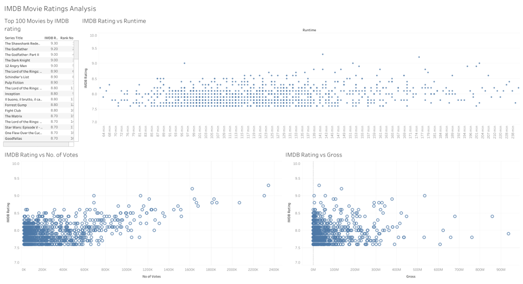 An analysis of the top 1000 IMDB movies, exploring the correlation between factors such as runtime, rating, gross and number of votes received. Upon analysis, there is a general trend that the higher the rating, the greater the number of votes received. However, the correlation between runtime and IMDB rating is less obvious, as some films are much shorter in length and are still rated very highly by IMDB users.